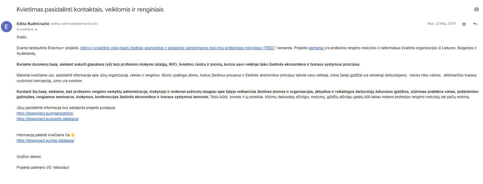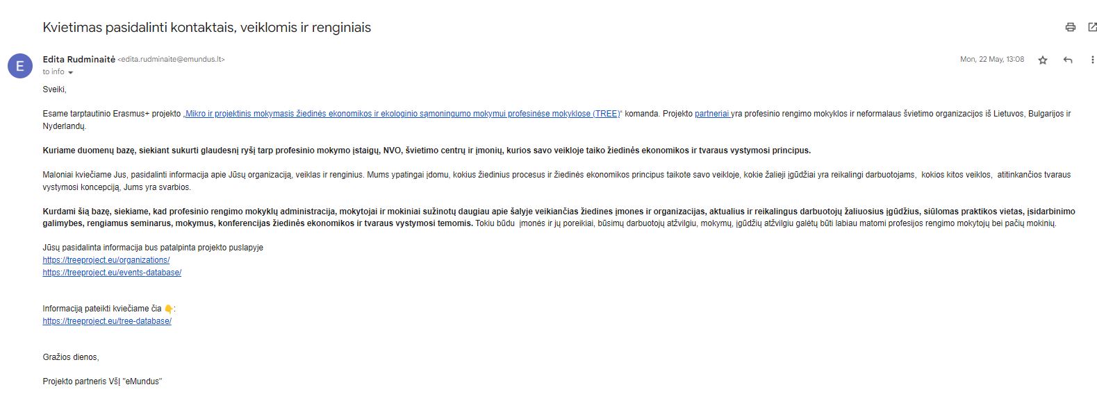 Informative emails about TREE project and invitation to participate in TREE database by providing infomation filing online form.