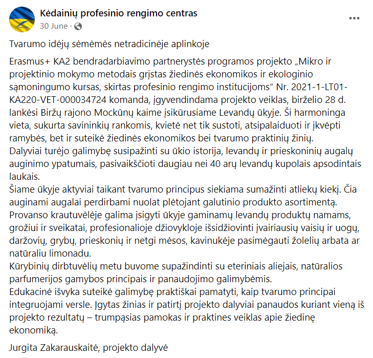 Raised awareness of ecological farming, sustainability, Circular Economy among teachers community of Kedainiai VETC.