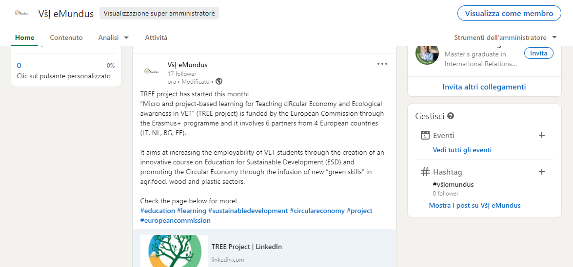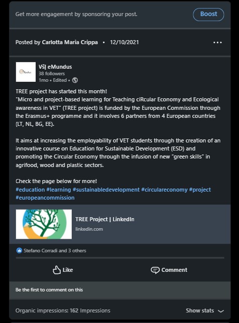 Erasmus+ programme's TREE project has been disseminated through a LinkedIn post, which was aimed at informing people about the beginning of the project. Within the post, the aim of the project, the field of action,the number and the names of the countries involved were reported.